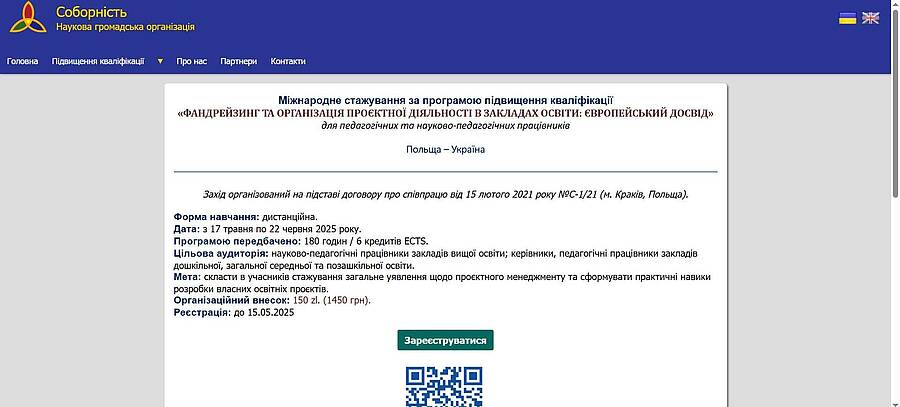 НГО "Соборність" запрошує науково-педагогічних працівників, дослідників та здобувачів освіти взяти участь у Міжнародному стажуванні за програмою підвищення кваліфікації «Фандрейзинг та організація проєктної діяльності в закладах освіти: європейський досвід» (Польща - Україна).