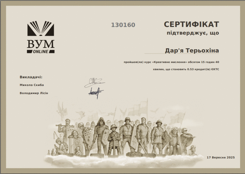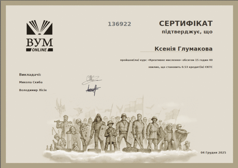 – курс «Креативне мислення» на платформі ВУМ Online, обсягом 15 годин 40 хвилин (0,53 кредити ЄКТС), який опанували Носова Ліна, Глумакова Ксенія та Терьохіна Дар’я;