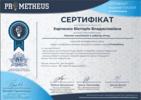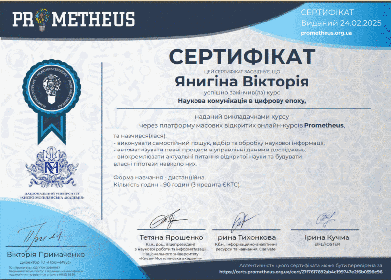 – курс «Наукова комунікація в цифровому середовищі», реалізований на платформі масових відкритих онлайн-курсів Prometheus, обсягом 90 годин (3 кредити ЄКТС), який пройшли Харченко Вікторія та Янігіна Вікторія;