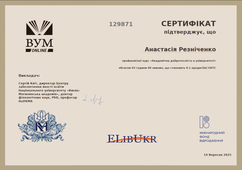 – курс «Академічна доброчесність в університеті» на платформі ВУМ Online, обсягом 3 години (0,1 кредиту ЄКТС), який пройшла Резніченко Анастасія.