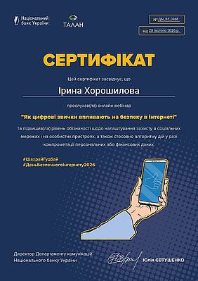У період з 9 по 13 лютого 2026 року викладачі кафедри обліку і оподаткування доценти Вербицька В.І та Хорошилова І.О. взяли участь у серії просвітницьких вебінарів, організованих Національним банком України спільно з Департаментом кіберполіції Національної поліції України, КРЕДОБАНКом, ПриватБанком та Райффайзен Банком. якими проводилась інформаційна кампанія з підвищення фінансової грамотності та кібербезпеки населення. Програма заходів була присвячена актуальним питанням протидії платіжному шахрайству, захисту персональних даних та безпечному користуванню цифровими сервісами.