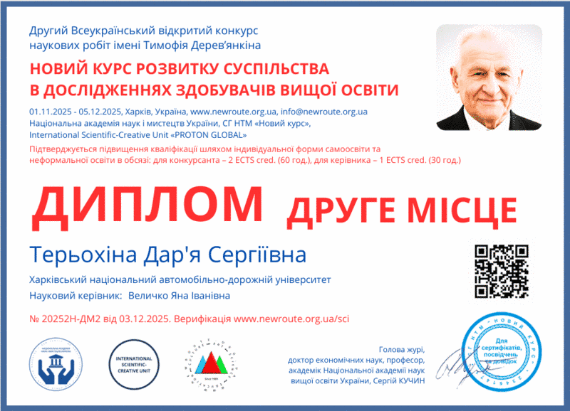 У цьому році студенти нашої кафедри знову продемонстрували сильні позиції - у фінальний шорт-лист увійшли одразу кілька робіт, а двоє здобувачів вибороли призові місця. Перше місце посів Коломієць Єгор Володимирович під керівництвом доцента Ведолажської Тетяни Олександрівни. Друге місце здобула Терьохіна Дар’я Сергіївна, яку до перемоги підготувала старший викладач Величко Яна Іванівна. Високий рівень наукового дослідження також показала Носова Ліна В’ячеславівна, чию роботу визнано однією з найкращих у шорт-листі; її науковий керівник - доцент Бочарова Надія Аваківна.