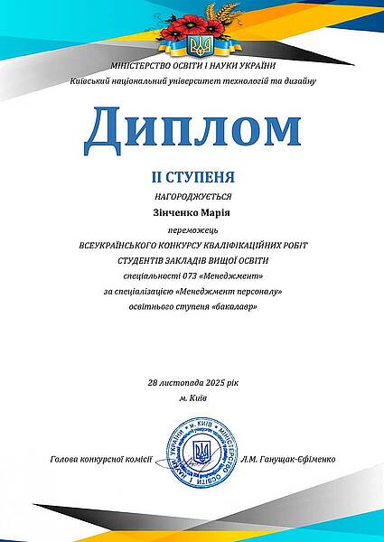 28 листопада 2025 року відбувся щорічний Всеукраїнський конкурс кваліфікаційних робіт студентів закладів вищої освіти за спеціальністю «073 Менеджмент», який проходив в онлайн-форматі на базі Київського національного університету технологій та дизайну. У конкурсі взяли участь студенти з різних регіонів України, представляючи свої дослідження у межах кількох спеціалізацій.