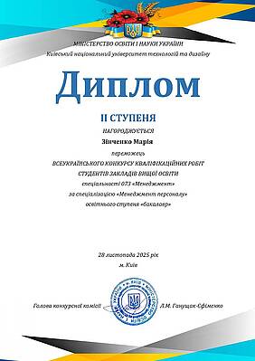 – рівень бакалавра: Марія Зінченко – диплом ІІ ступеня (науковий керівник – доцент кафедри менеджменту Тетяна Водолажська);
