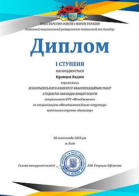 – рівень бакалавра: Вадим Кравцов – диплом І ступеня (науковий керівник – професор кафедри менеджменту Оксана Криворучко);