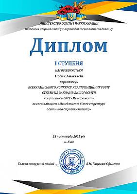 – рівень магістра: Анастасія Носик – диплом І ступеня (науковий керівник – професор кафедри менеджменту Оксана Криворучко).