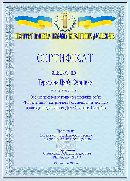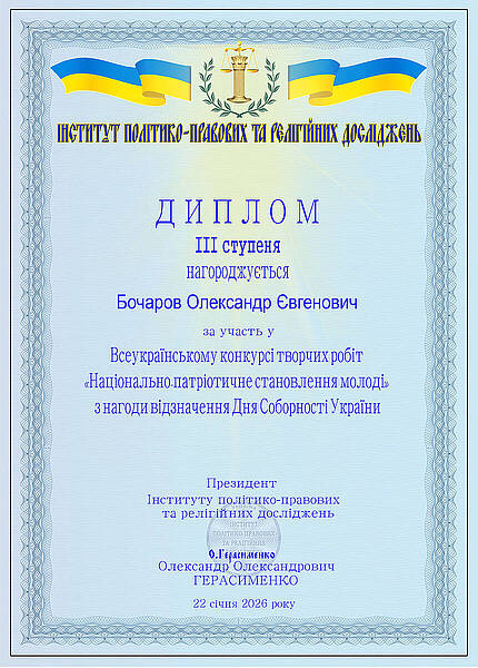 22 січня, у День Соборності України, відбулося урочисте вручення дипломів і сертифікатів учасникам та переможцям Всеукраїнського конкурсу творчих робіт «Національно-патріотичне становлення молоді», ініційованого Інститутом політико-правових та релігійних досліджень.
