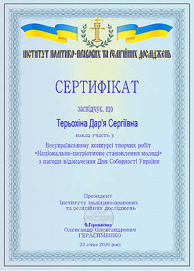 Дар’я Терьохіна (науковий керівник – ст. викл. Яна Величко) нагороджена сертифікатом учаника.