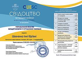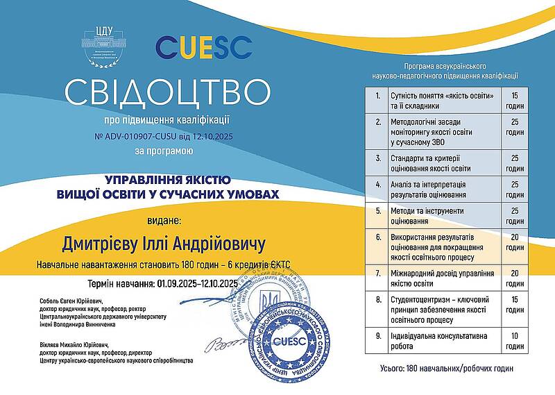 У період з 1 вересня по 12 жовтня 2025 року проректор з наукової роботи, професор кафедри менеджменту, д.е.н., проф. Дмитрієв І.А. та декан факультету управління та бізнесу, професор кафедри економіки і підприємництва, д.е.н., проф. Шевченко І.Ю. підвищили кваліфікацію за програмою Всеукраїнського науково-педагогічного підвищення кваліфікації «Управління якістю вищої освіти у сучасних умовах», організованого Центральноукраїнським державним університетом імені Володимира Винниченка (м. Кропивницький) спільно з Центром українсько-європейського наукового співробітництва.