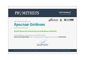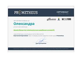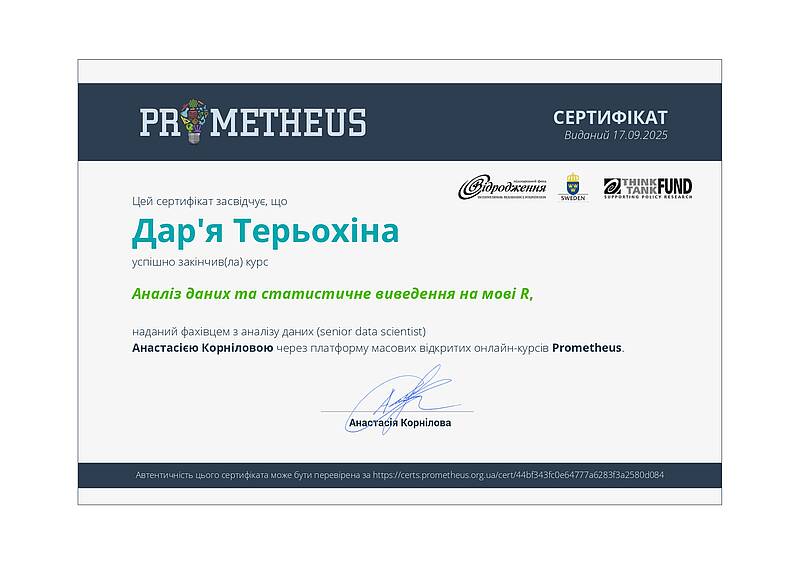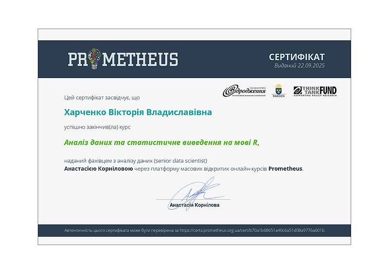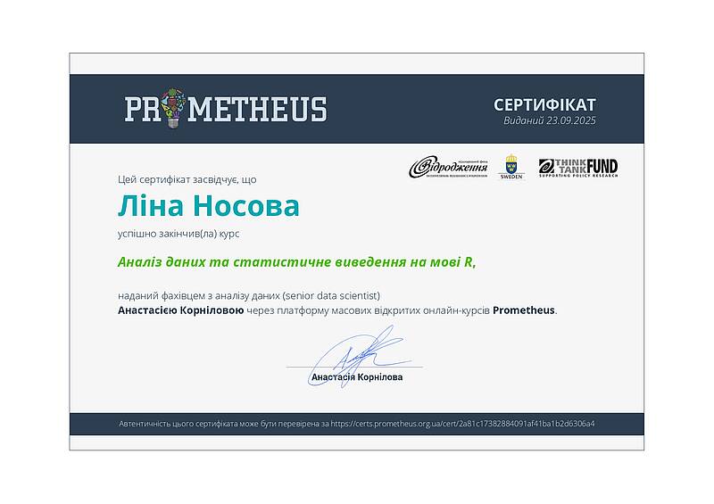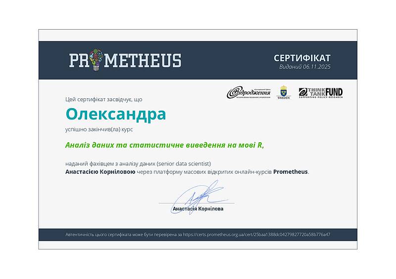 Інша група здобувачів успішно завершила курс «Аналіз даних та статистичне виведення на мові R» на платформі масових відкритих онлайн-курсів Prometheus. Сертифікати отримали Анастасія Кожан, Ліна Носова, Ярослав Олійник, Олександра Склярова, Дар’я Терьохіна, Вікторія Харченко, Вікторія Янигіна. Курс забезпечив формування практичних навичок роботи з даними, статистичного аналізу та інтерпретації результатів із використанням сучасних цифрових інструментів.