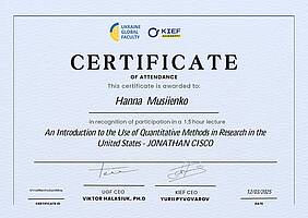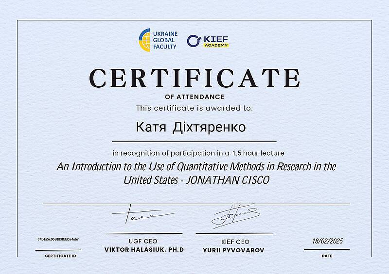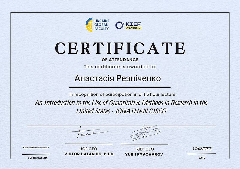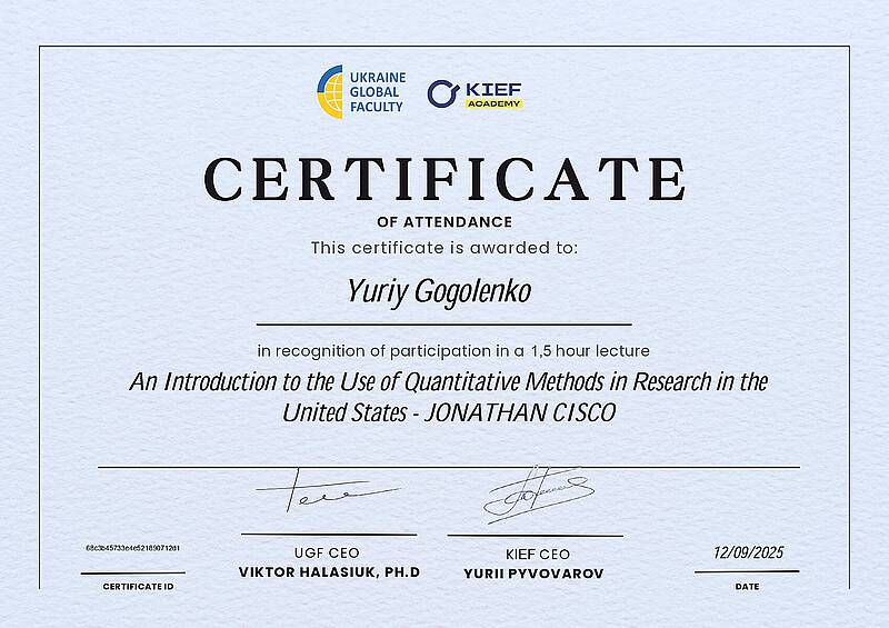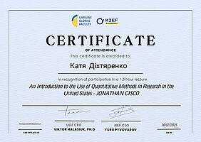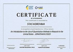 Частина здобувачів отримала сертифікати за результатами проходження міжнародного курсу “An Introduction to the Use of Quantitative Methods in Research in the United States” (лектор — Jonathan Cisco) по програмі Ukraine Global Faculty спільно з KIEF Academy. Участь у програмі взяли Юрій Гоголенко, Катерина Діхтяренко, Станислав Корчма, Ганна Мусієнко, Анастасія Резніченко. Курс був спрямований на опанування базових підходів до застосування кількісних методів у наукових та прикладних дослідженнях, що є важливою складовою техніко-економічного аналізу.