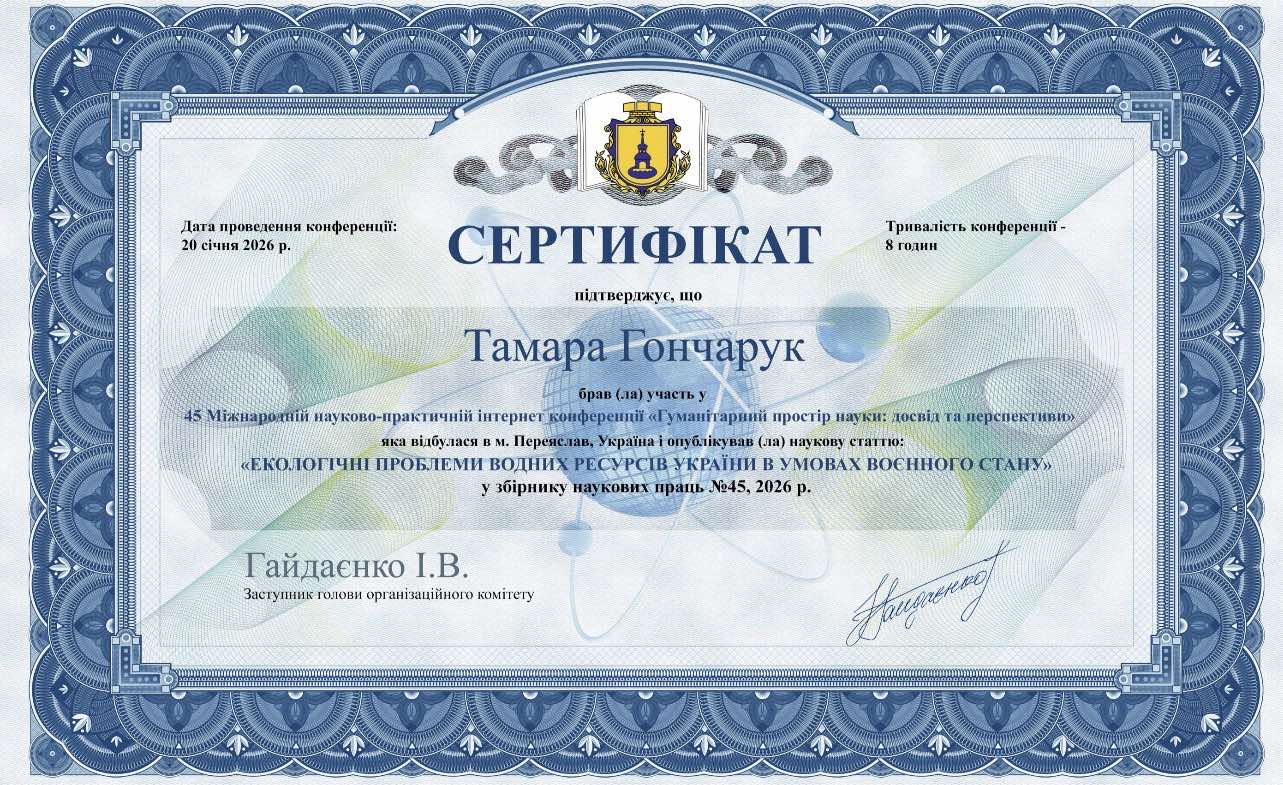 Міжнародна наукова конференція «EDUCATIONAL AND SCIENTIFIC ACTIVITY IN A NEW TIME: REALITIES AND CHALLENGES» (16-17 грудня 2022 р.), Мингячевирський державний університет, Азербайджан.