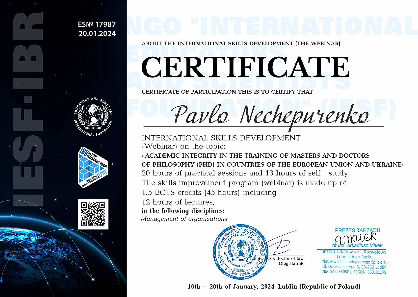 Підвищення кваліфікації «Academic integrity in the training of masters and doctors of phylosofy (PHD) in countries of the European Union and Ukraine» (45 годин / 1,5 ECTS), 10th - 20th of January, 2024, Lublin (Republic of Poland), сертифікат ES№17987 від 20.01.2024 р.