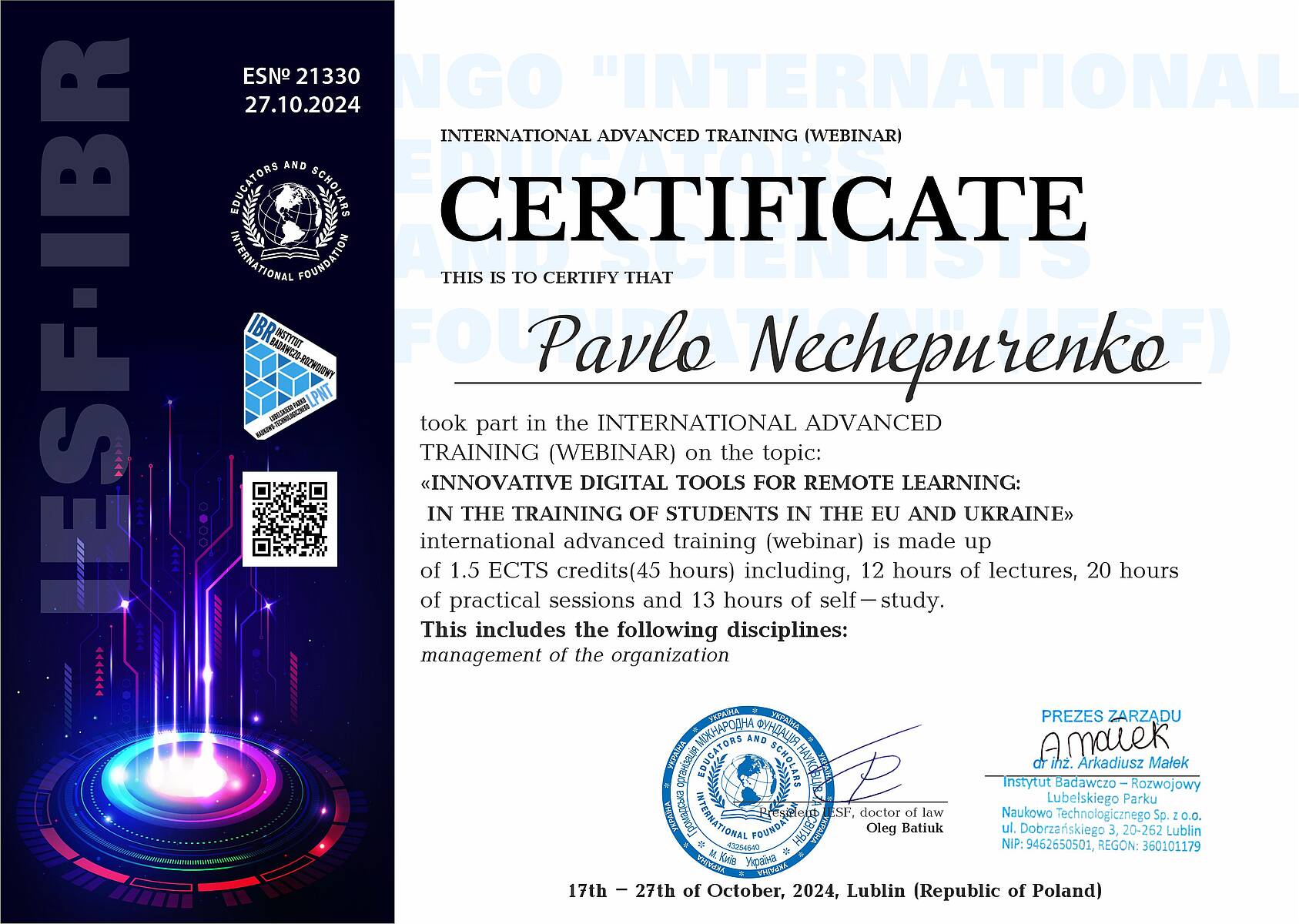 Міжнародне підвищення кваліфікації у форматі вебінару «Innovative digital tools for remote learning: in the training of students in the eu and Ukraine» (45 годин / 1,5 ECTS), організоване IESF (Польща, 17–27 жовтня 2024 р.), що підтверджується сертифікатом № ESN° 21330 від 27.10.2024.