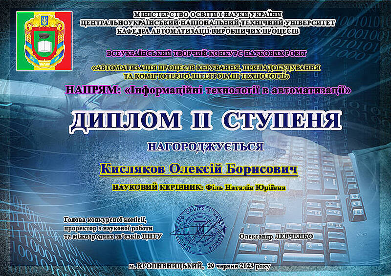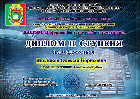 За результатами проведення конкурсу бакалавр Кисляков О.Б. з роботою «Інформаційна технологія та модель підбору персоналу для реалізації стартапу у нечітких умовах» нагороджено дипломом ІІ ступеня у напрямі «Інформаційні технології в автоматизації». Керівник, доцент кафедри АКІТ Філь Н. Ю.