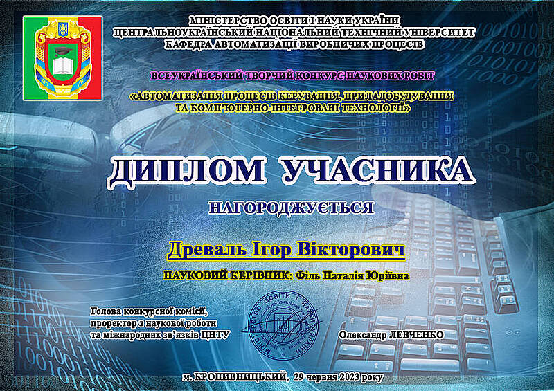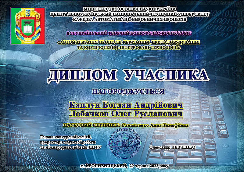 Студенти кафедри АКІТ взяли активну участь у Всеукраїнському творчому конкурсі наукових робіт «Автоматизація процесів керування, приладобудування та комп’ютерно-інтегровані технології», який  проходив 29 червня 2023 року на базі Центрально українського національного технічного університету, м. Кропивницький.