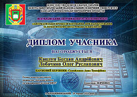 Роботи студентів Каплуна Б.А. і Лобачкова О.Р. «Звуковий сигналізатор граничних режимів роботи екскаватора» керівник доцент кафедри АКІТ Біньковська А.Б. отримала диплом учасника.