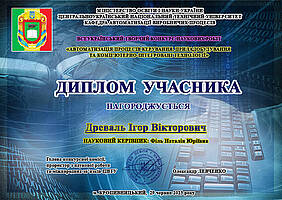 Робота студента Древаль І.В. «Оцінка ергономічних показників кабіни екскаватору в нечітких умовах» керівник доцент кафедри АКІТ отримала диплом учасника.