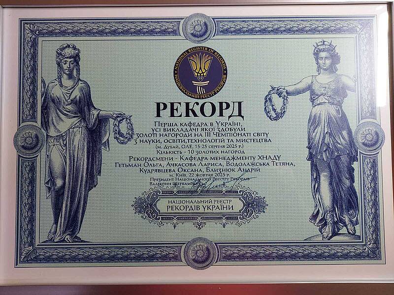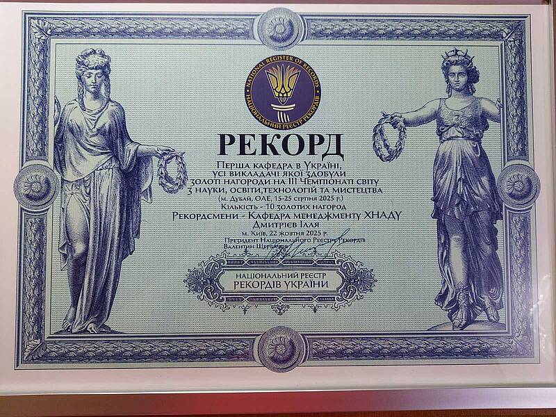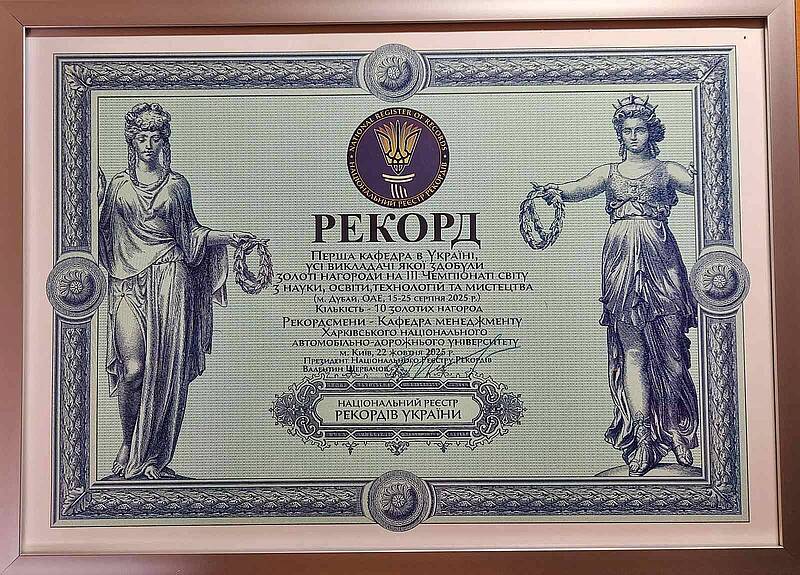 22 жовтня 2025 року кафедра менеджменту Харківського національного автомобільно-дорожнього університету офіційно увійшла до Національного реєстру рекордів України як перша кафедра в Україні, усі викладачі якої здобули золоті нагороди на ІІІ Чемпіонаті світу з науки, освіти, технологій та мистецтва, що проходив у місті Дубай (ОАЕ) з 15 по 25 серпня 2025 року.
