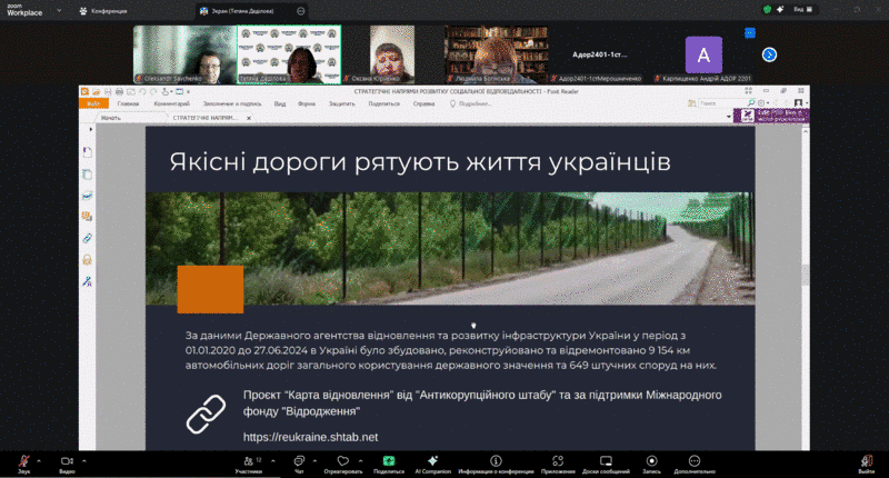 Здобувачі вищої освіти активно долучалися до дискусії, ставили запитання та висловлювали власні думки щодо ролі соціальної відповідальності в інфраструктурному секторі.
