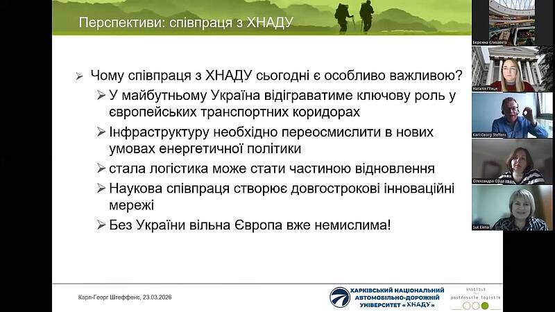 У межах розширення міжнародної співпраці відбулася відкрита онлайн-лекція професора Karl-Georg Steffens, директора Інституту постфосильної логістики (Німеччина). Спікер представив системне бачення трансформаційних процесів у галузі та окреслив стратегічні орієнтири розвитку логістики в умовах декарбонізації економіки.