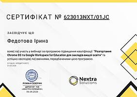 31 березня 2026 року викладачі кафедри менеджменту проф. Ірина Федотова, доц. Лариса Ачкасова, доц. Андрій Близнюк, доц. Надія Бочарова й доц. Тетяна Водолажська взяли участь у підвищенні кваліфікації у практичному вебінарі «Розгортання Chrome OS та Google Workspace for Education для закладів освіти», організованому для представників закладів вищої освіти. За результатами навчання учасники успішно отримали сертифікати, що підтверджують підвищення їхніх цифрових компетентностей.