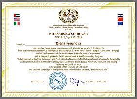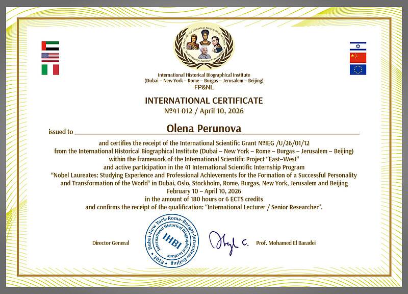 Доцент кафедри обліку і оподаткування Олена Миколаївна Перунова взяла участь у 41 Міжнародній програмі наукового стажування (обсяг програми 180 годин, або 6 кредитів ECTS) “Нобелівські лауреати : вивчення досвіду та професійних досягнень для формування успішної особистості та трансформації оточуючого світу“, яка адаптована відповідно вимог законодавства України в галузі освіти і науки.