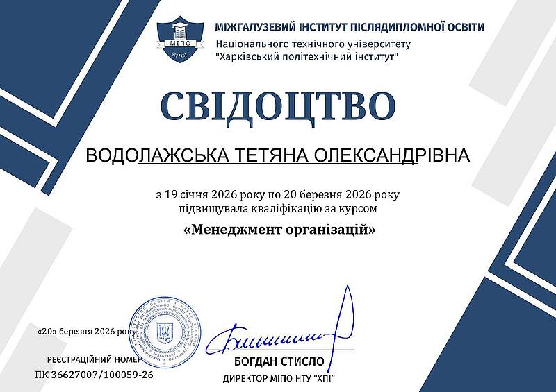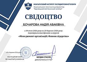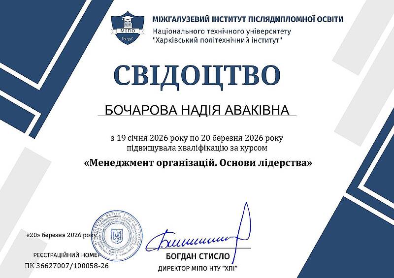 У період з 19 січня 2026 року по 20 березня 2026 року викладачі кафедри менеджменту – Надія Бочарова та Тетяна Водолажська – пройшли професійне підвищення кваліфікації у Міжгалузевий інститут післядипломної освіти Національного технічного університету «Харківський політехнічний інститут».