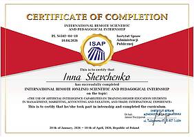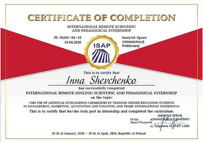 У період з 20 січня по 10 квітня 2026 року професор кафедри економіки і підприємництва Шевченко І.Ю. підвищила кваліфікацію за програмою Міжнародного дистанційного науково-педагогічного стажування «Використання можливостей штучного інтелекту при підготовці здобувачів вищої освіти спеціальностей менеджмент, маркетинг, облік і оподаткування, торгівля: міжнародний досвід» в Інституті справ адміністрації публічної ISAP (м. Люблін, Польща).