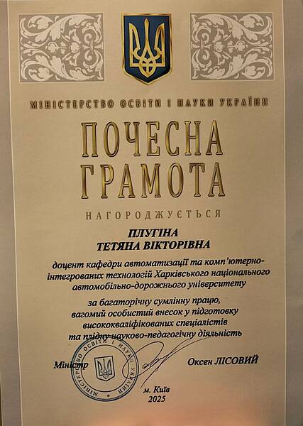 Вітаємо доцента кафедри АКІТ Плугіну Тетяну Вікторівну з отриманням почесної грамоти