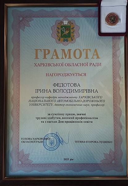 Колектив кафедри менеджменту щиро вітає професора Ірину Федотову із отриманням Грамоти Голови Харківської обласної ради Тетяни Єгорової-Луценко за сумлінну працю, значні трудові здобутки, високий професіоналізм та з нагоди Дня працівників освіти!