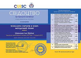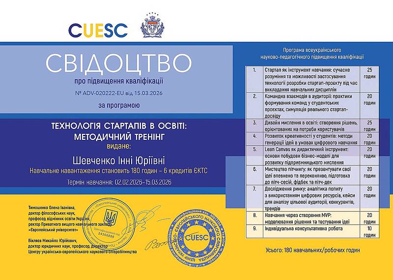 У період з 2 лютого по 15 березня 2026 року професор кафедри економіки і підприємництва Шевченко І.Ю. підвищила кваліфікацію за програмою Всеукраїнського науково-педагогічного підвищення кваліфікації «Технологія стартапів в освіті: методичний тренінг», організованого Приватним вищим навчальним закладом «Європейський університет» спільно з Центром українсько-європейського наукового співробітництва.